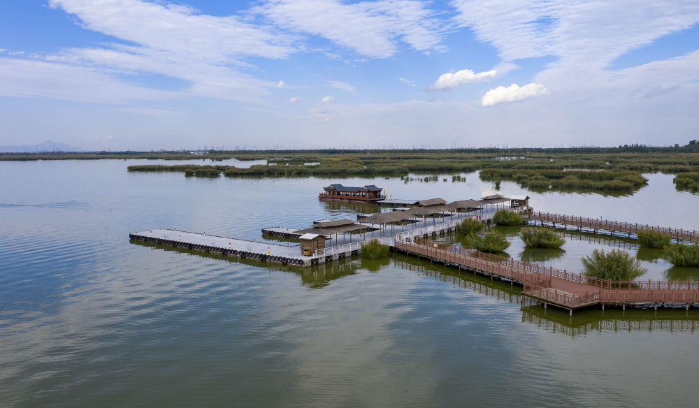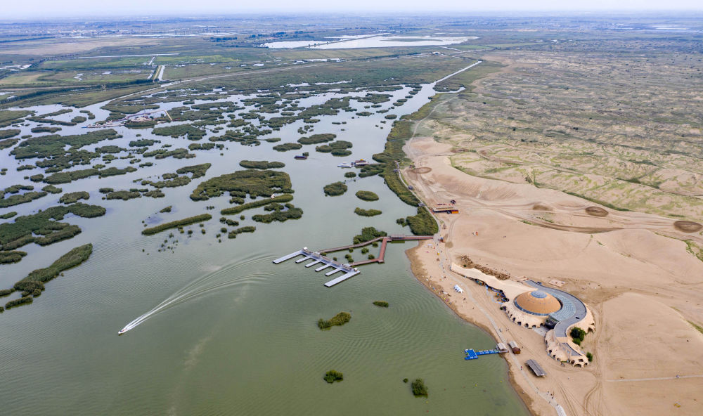 仲秋时节,位于宁夏银川市以北42公里处的石嘴山市平罗县境内的沙湖景区处处呈现沙水相依、碧波万顷的美丽画卷。