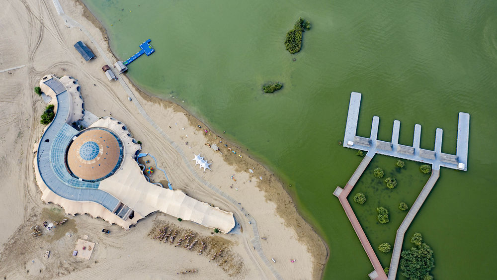 这是8月28日拍摄的宁夏沙湖景区(无人机照片)。