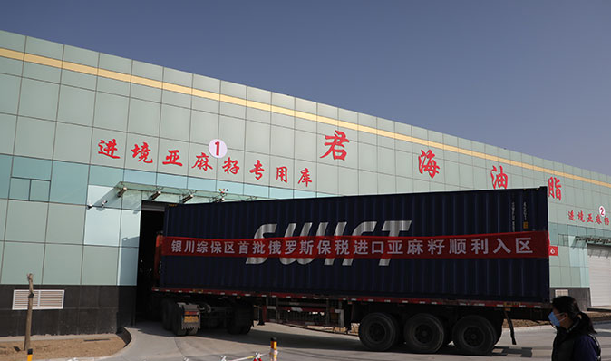 9日,宁夏君海油脂有限公司从俄罗斯进口的首批1600吨亚麻籽运抵银川综合保税区,该批亚麻籽是首批适用通关一体化政策,以保税方式运抵宁夏的进口亚麻籽。