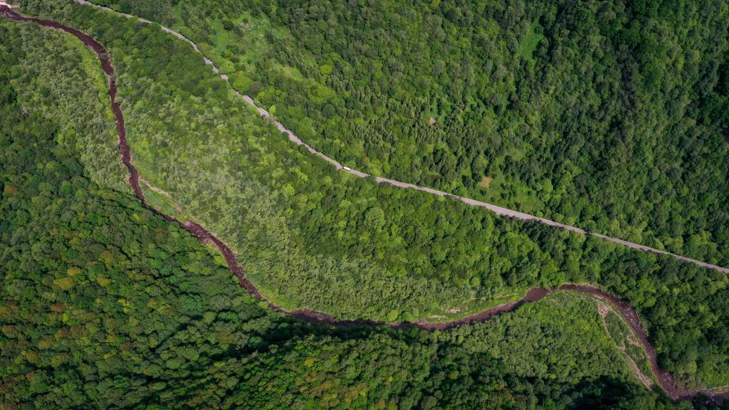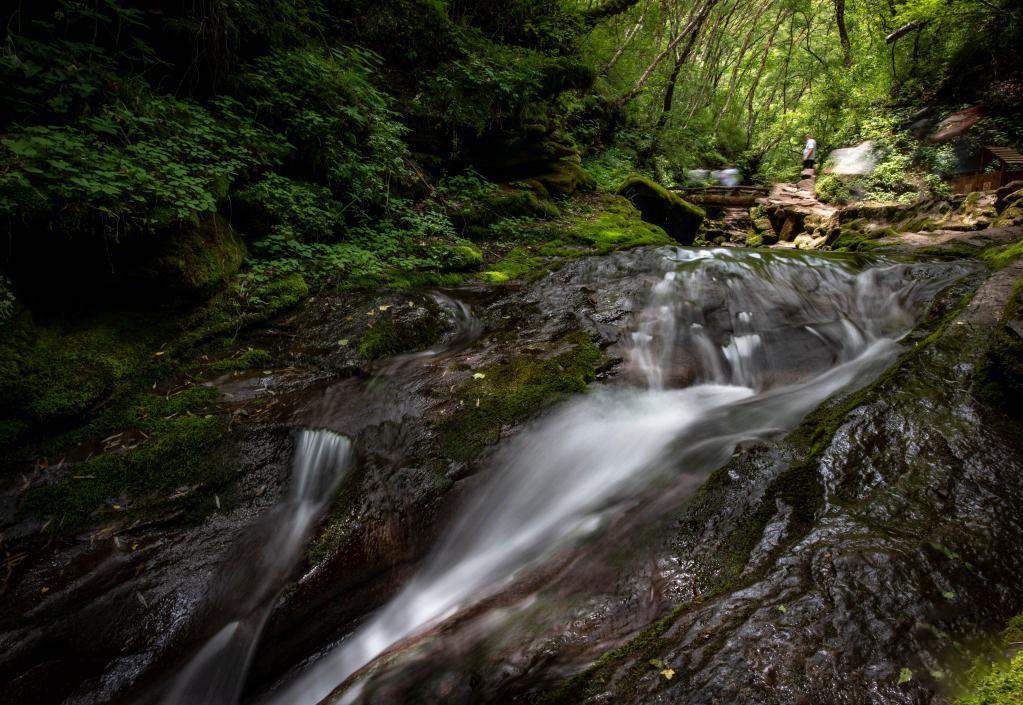 7月8日,游客徒步经过六盘山国家森林公园内一处溪流。