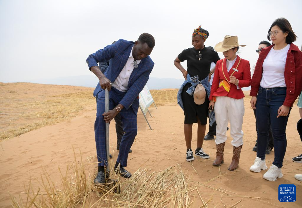 来自肯尼亚的北京大学南南学院在读博士麦克(左一)在腾格里沙漠体验扎草方格(5月31日摄)。