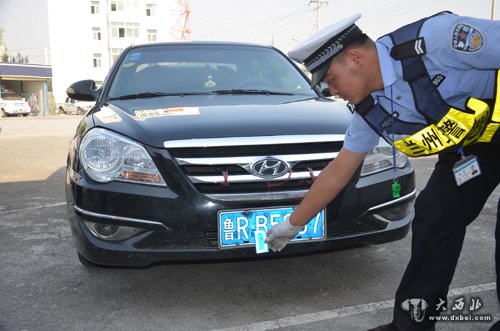 大西北网8月13日讯 8月12日上午,驾驶人张某在南滨河路为其驾驶的鲁RB5887的黑色北京现代轿车更自制的字母号牌时,被龚家湾大队民警发现并查扣,将对张某以伪造变造号牌记12分,罚款4000元的处罚。(记者 金振华 摄影报道)