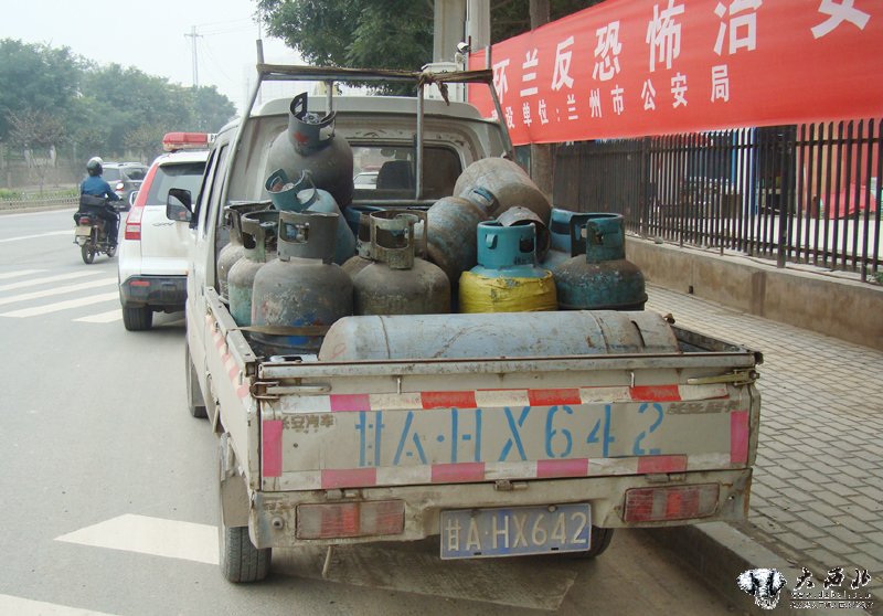 大西北网9月2日讯 8月29日14时,兰州市公安局交警支队龚家湾大队民警在晏北路东口卡口点进行检查时,发现一辆车号为甘AHX64*的小型货车运输一车液化气罐,车辆无危险品警示标志、无安全员,在禁行时段运输危险化学品。执勤民警立即拦停该车,进行检查,并依据《甘肃省道路交通安全条例》第八十二条第二十一项的规定,对司机吴某处以200罚款、记6分的处罚。