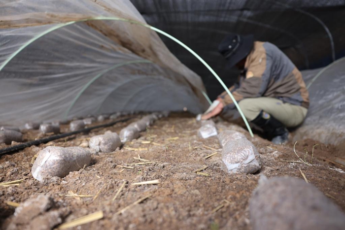 银宝在大棚内半蹲着,一边察看营养包放置情况,一边用铁锹将泥土堆在塑料薄膜两端压实,保证土壤周边温度恒定。按照生长规律,再过几天,白色的菇蕊将冒头出现,黝黑的土地上将撒满“星星”。