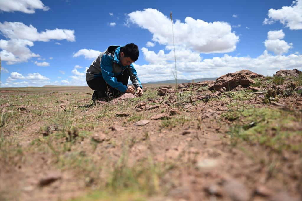 申添毅在查看岩石特征。(新华社记者 张龙摄)