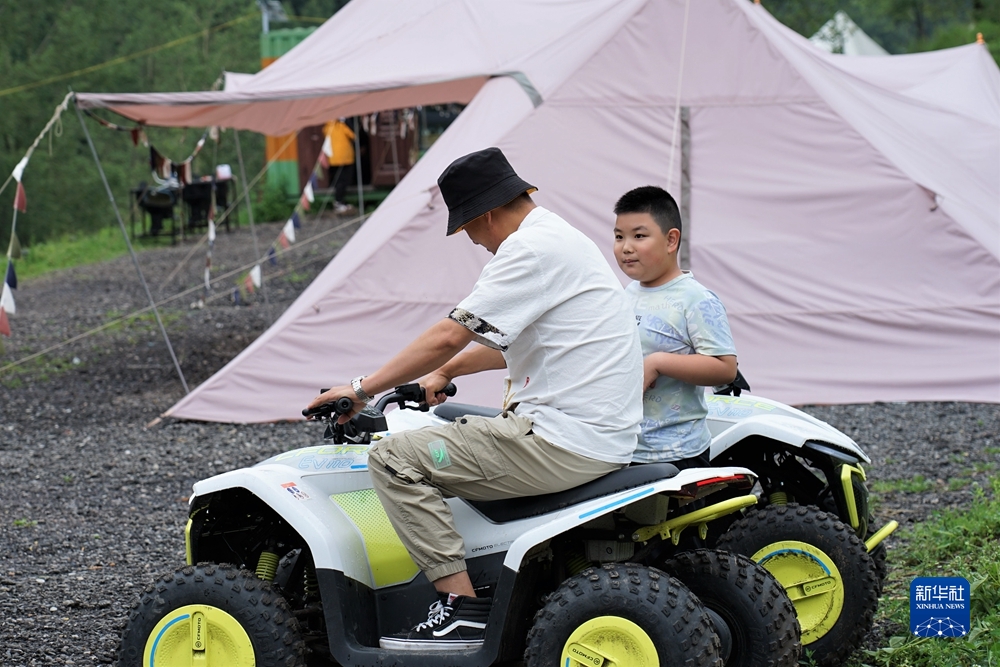 7月17日,在“夏天的风”露营营地游客正在体验山地越野摩托车。新华社记者 解统强 摄