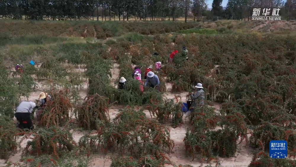 金秋时节,在位于柴达木盆地东南部的青海省海西蒙古族藏族自治州都兰县,20余万亩枸杞迎来丰收季,红玉般晶莹剔透的果实压弯了根根枝条,采收工人抓紧采收,争取更好地保持枸杞的新鲜度。
