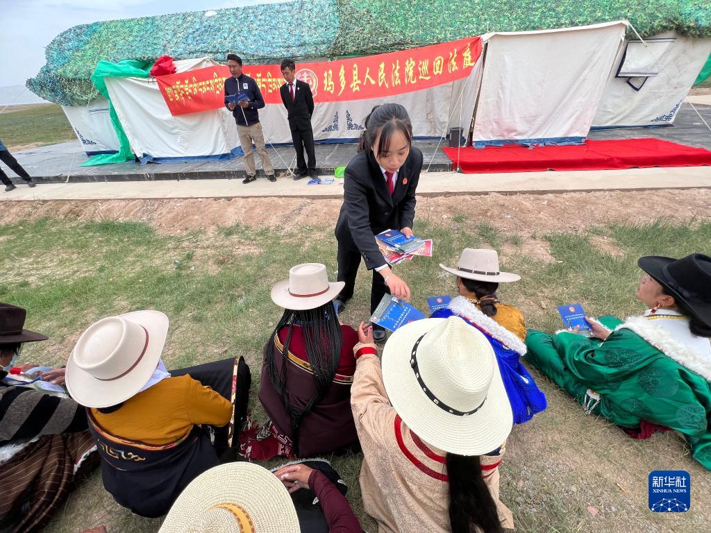 2022年7月12日,在玛多县花石峡镇吉日迈村,玛多县人民法院立案庭庭长才侦措(中)在开展环境保护相关法律宣传。新华社发