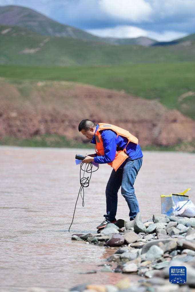 长江科学院流域水环境研究所副所长赵良元在长江上游通天河流域观测水文(2021年7月24日摄)。新华社记者张龙摄