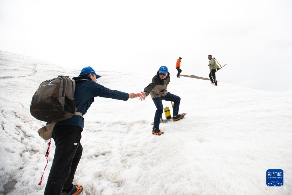 在长江源各拉丹冬雪山,来自长江科学院的科考队员范越(左二)在搬运探测设备(2022年7月28日摄)。新华社记者肖艺九摄