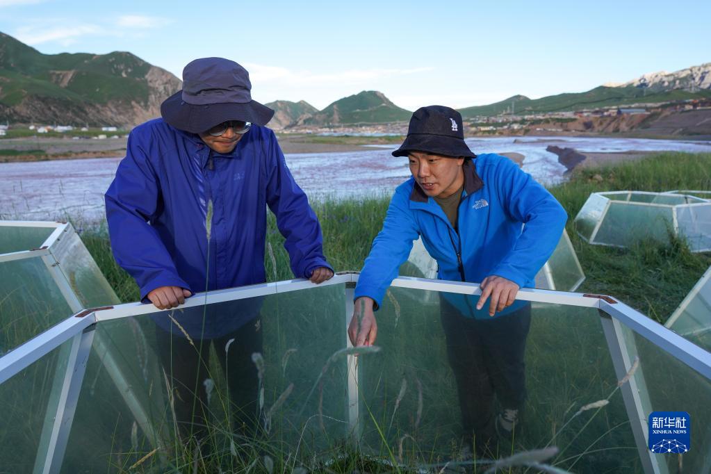 长江科学院博士任斐鹏(右)和孙宝洋在江源布设六边形温箱开展“模拟增温试验”(2021年7月22日摄)。新华社记者张龙摄