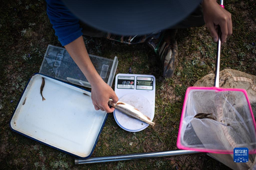 长江科学院科考队员刘晗在长江南源当曲对采集的一尾小头裸裂尻鱼称重(2022年7月25日摄)。新华社记者肖艺九摄