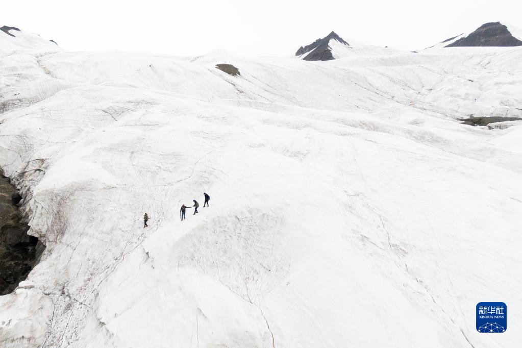 来自长江科学院的科考队员在各拉丹冬雪山上(2022年7月28日摄,无人机照片)。新华社记者肖艺九摄