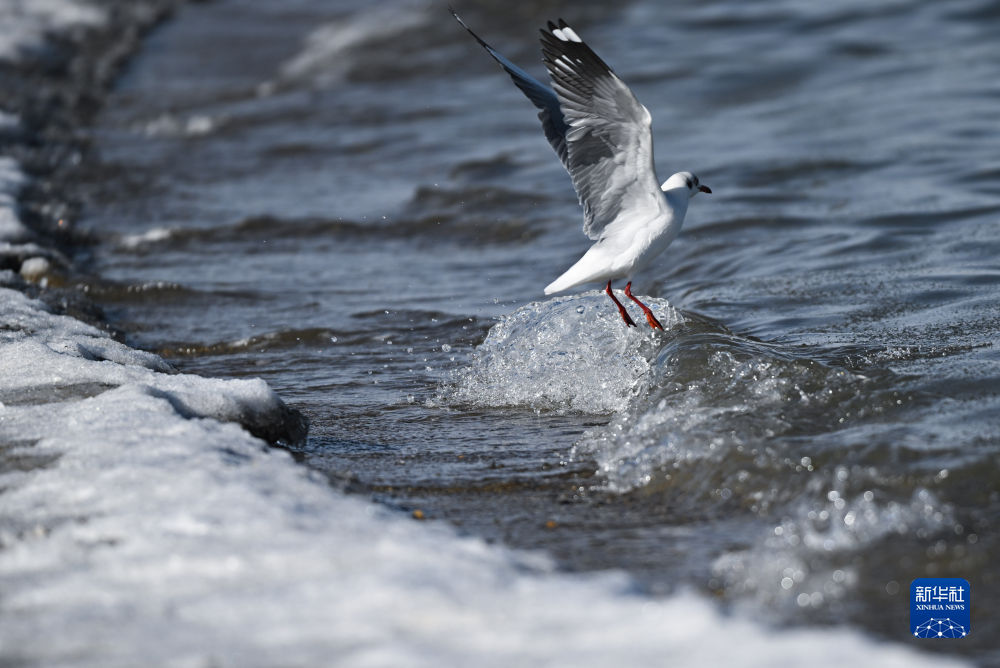 2022年12月9日,一只棕头鸥在青海湖展翅。(新华社记者张龙摄)