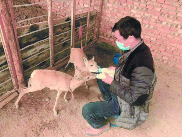 哈尔盖镇牧民在喂养救助的小普氏原羚。记者丁玉梅通讯员张得存摄