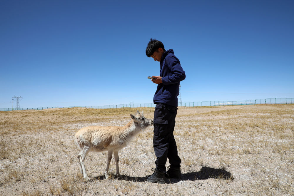 4月15日,索南达杰保护站巡山队员才文多杰在拍摄被救助藏羚羊幼崽的生长情况影像。新华社记者黄豁摄