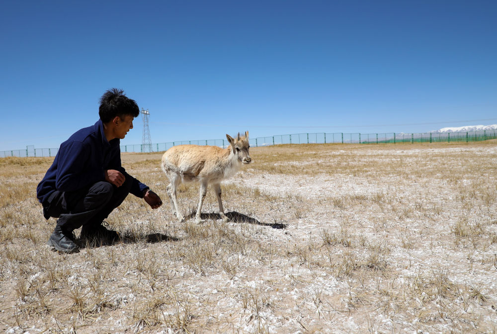 4月15日,索南达杰保护站巡山队员才文多杰与被救助藏羚羊幼崽互动。新华社记者王金金摄
