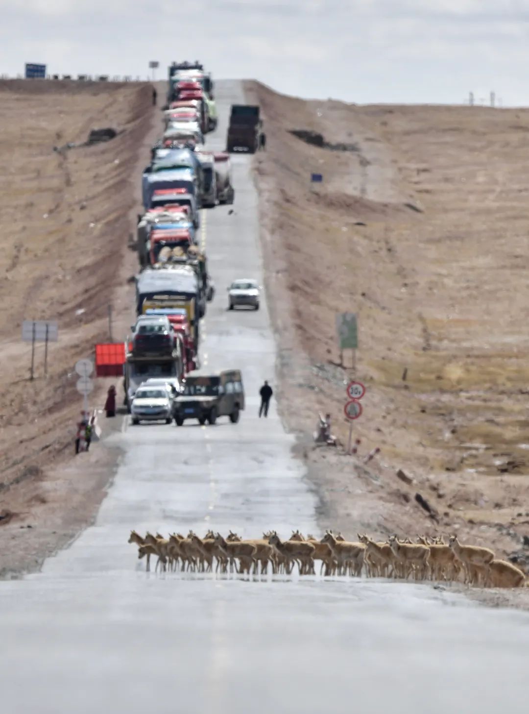 而在青藏公路这头,可可西里管理处安排工作人员采取短暂交通管制、禁止鸣笛、巡护救助等措施,为藏羚羊迁徙产仔保驾护航。伴随迁徙高峰期的到来,藏羚羊“过公路”已经成为青藏公路沿线的一道独特风景。