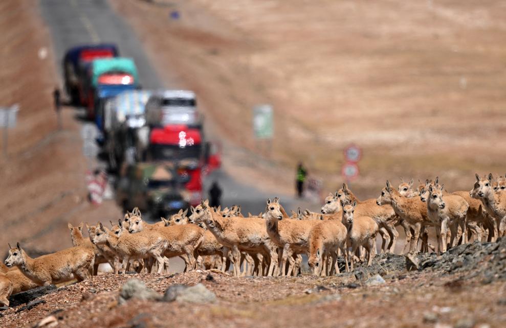 2023年5月29日,一群待产雌性藏羚羊正在通过青藏公路前往可可西里卓乃湖产仔。新华社记者张宏祥 摄