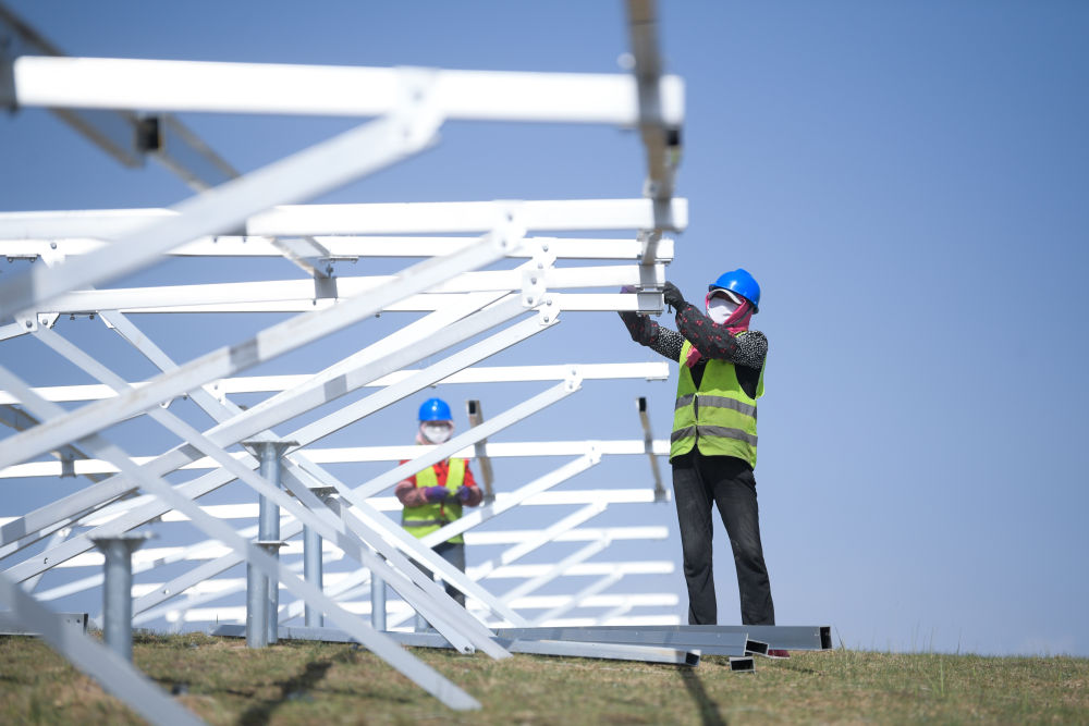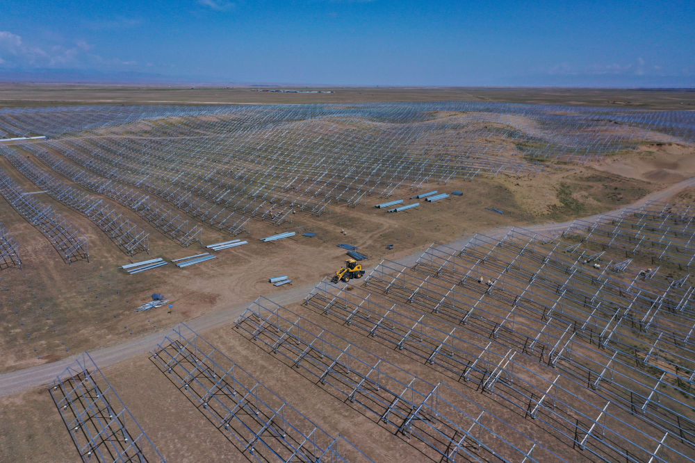 ↑2022年6月8日,工人在黄河上游水电开发有限责任公司海南基地共和县100万千瓦光伏项目施工。新华社记者张龙摄