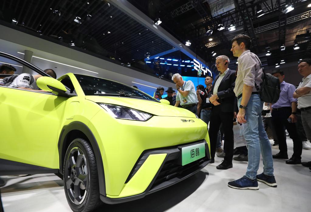参观者在比亚迪展台上展出的海鸥样车前驻足观看。新华社记者方喆摄