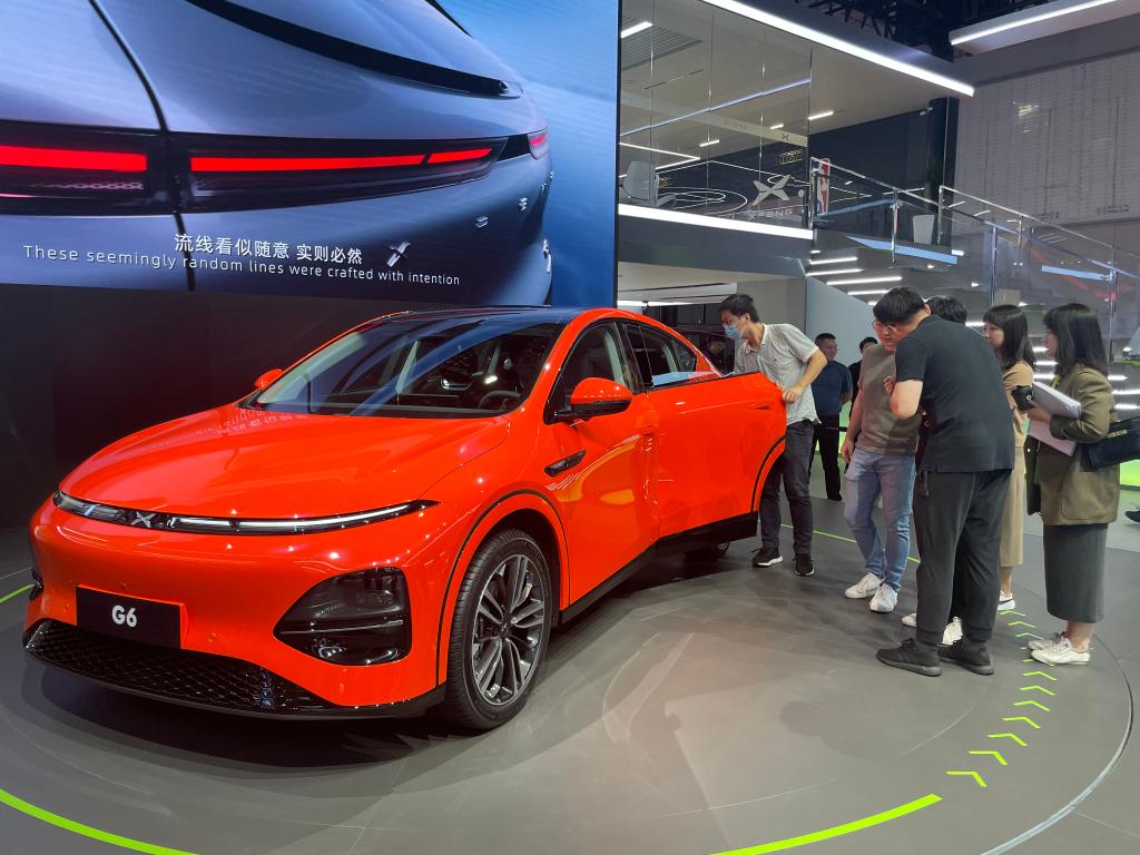 小鹏汽车展台上观众在看车咨询。新华社记者王辰阳摄