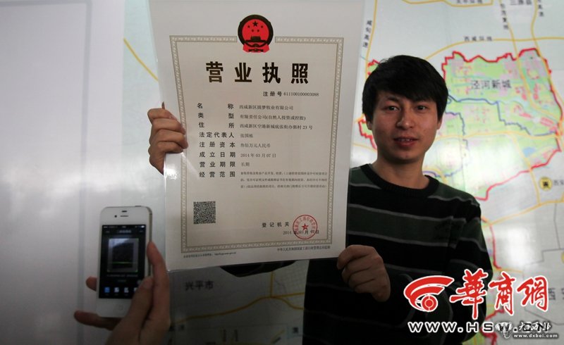 昨日拿到执照,张国栋用手机扫了一下二维码,立即显示出执照的注册号、企业名称、登记机关、登记时间以及信用公示系统(http://xygs.snaic.gov.cn/)。进入该系统页面显示为“陕西省工商企业信用信息公示系统”,输入企业名称、注册号、法定代表人,即出现企业的注册资金等,还显示行政处罚信息。