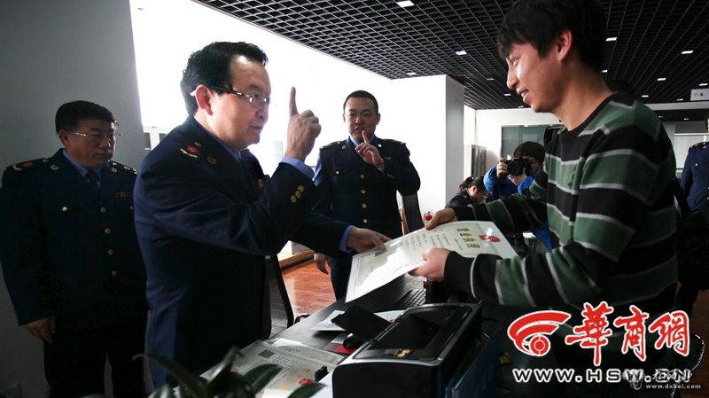 昨日,西咸新区政务大厅,省工商局党组书记薛华颁发了我省第一张新版营业执照,执照由横版变成了竖版本报记者黄利健摄