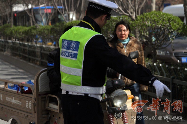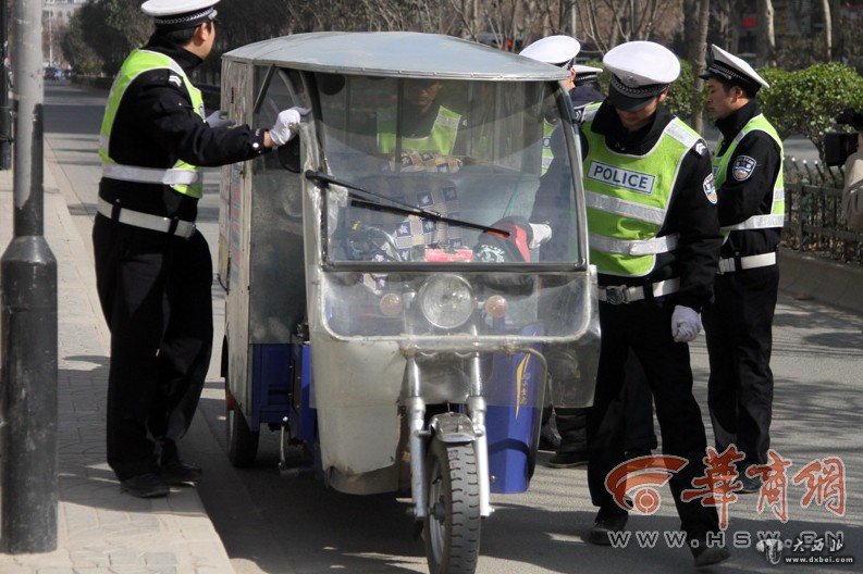 交警在丈八北路与鱼化寨街丁字路口查处三轮摩托车