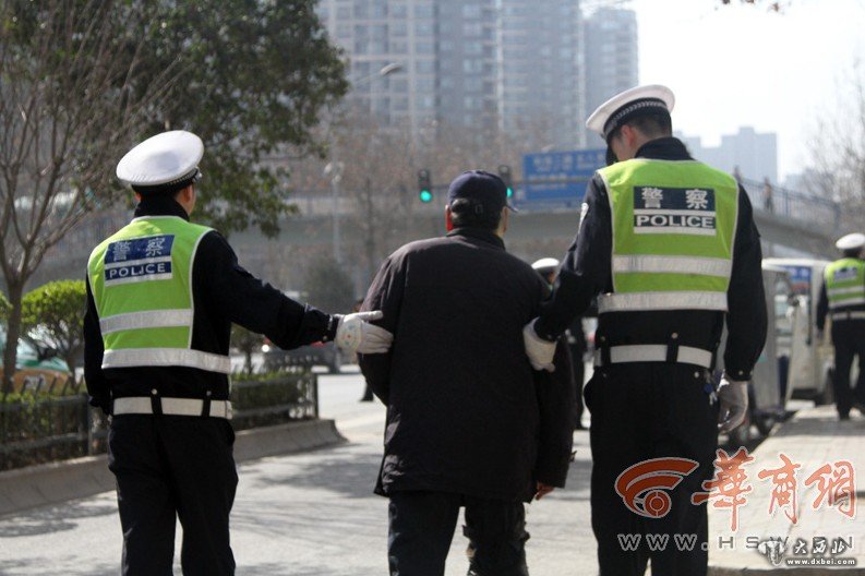 交警在丈八北路与鱼化寨街丁字路口查处非法营运三轮摩托,搀扶行动不便的驾驶者。