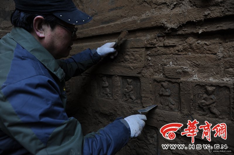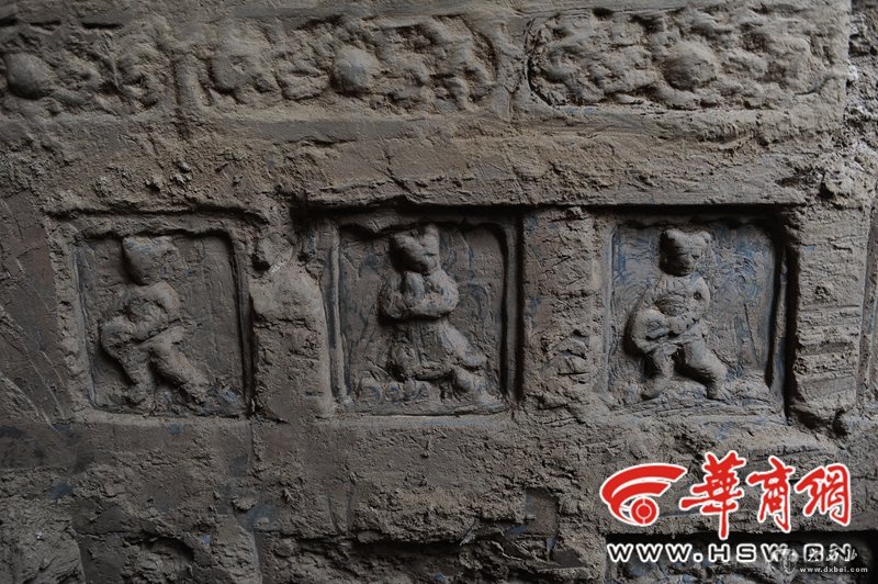 古墓内打腰鼓等砖刻富有陕北民俗特色 记者 赵雄韬 摄