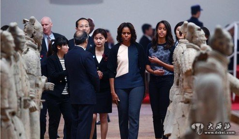 大西北网3月25日讯 据西部网报道 应国家主席习近平夫人彭丽媛邀请,美国总统奥巴马夫人米歇尔·奥巴马以及米歇尔的母亲和两个女儿昨日从北京抵达西安参观了兵马俑,在短短的一个多小时里,米歇尔一行领略2000多年前威武浩荡的秦俑军阵,与中国历史文化“零距离”接触。随后,她们游览了西安城墙。