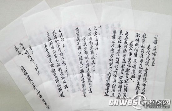 大西北网3月25日讯 据西部网报道 (记者 熊惠玲) 日前,陕西师范大学校党委书记甘晖、校长房喻收到了原中共中央政治局常委、国务院总理温家宝同志的亲笔信,温家宝在信中希望教师教学要“用情、用心、用功,重启、重思、重能”。