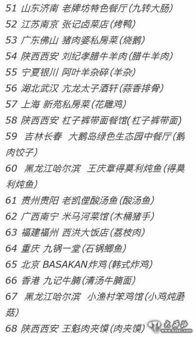 大西北网3月26日讯 据西部网报道 日前,某网站发起70个城市700位专业吃货,组成吃货自媒体联盟,选出中国100家最好吃的餐厅,涵盖八大菜系和有影响的其他菜系。在长长的榜单中,陕西景德泡馍排全榜首位,西安饭庄排13,三原老黄家西安店排49,刘纪孝腊牛羊肉排54,杠子裤带面餐馆排58,王魁肉夹馍排68。作为美食之都的大陕西,居然才上榜6家,很多网友表示不服!