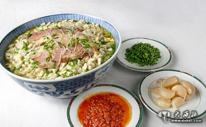 厨师需要将和好的面团拉成与裤带一样的面条(所以biangbiang面又被称为“裤带面”),再上下甩上两甩,“biang!biang!”的声音就是这么来的。biangbiang面嚼起来劲道,因为用热油烫过,面条表面薄薄地一层香脆,再与辣椒、豆芽、大蒜搭配香气扑鼻,正所谓吃面不吃蒜,营养减一半。