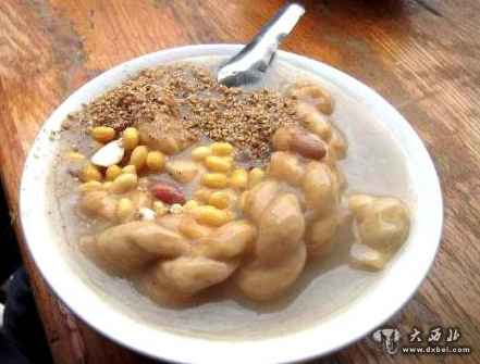 油茶麻花是西安的传统坊间小吃,麻花泡在油茶里,待到绵软后再食,此时油香、面香和着嚼碎的芝麻、杏仁、黄豆、花生干果的香味可一同把饥饿的感觉一扫而尽。 油茶,是坊间特色小吃。以小麦面粉和杏仁或油炸豆腐干加花椒粉等调味料,用清油炒熟熬成汤。油茶养人,是瘦人想胖起来的首选食品。