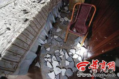 “我睡眠比较浅,凌晨3点多,我突然听到天花板发出一阵‘吱吱’的响动,立即就醒了。随着‘吱吱’声越来越大,我推了一把老伴儿说‘可能地震了,快跑’,说完我俩赶紧下床。就在这时,屋顶天花板‘哗哗’地开始往下掉水泥皮。”据粗略估计,脱落的水泥皮重量约50公斤。