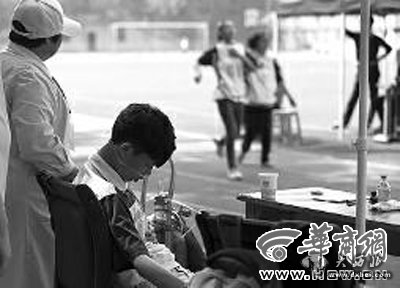 昨日,西安市第一中学,一名考完1000米跑的男生坐在医疗点吸氧 本报记者 黄利健 摄