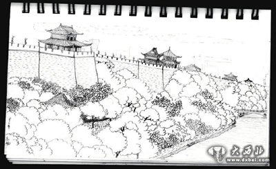 先勾勒出城墙主体的一砖一瓦,再描绘周边的植物、护城河等景物……5月18日下午,来自西安美术学院的高扬同学,现场速写,让东南城角附近的一段城墙跃然纸上。