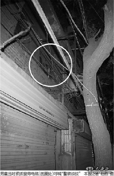 “我顺着喊声抬头随意看了一眼,大吃一惊,半空中竟然悬着一个三四岁模样的小男孩。”龙燕民说,当时小孩一手紧紧抓着一根距离窗户约10厘米远的电缆线,另一只手紧紧扒着窗户,从地面看小男孩犹如挂在电缆线上似的,“电缆距离地面约3米高,成年人跳下来应该没什么问题,但对于一个三四岁的小孩来说,这样的高度还是很危险的。”