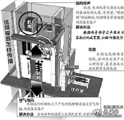 长安大学建筑声光研究所所长李国华教授说,传播过程中有结构传声和空气传声,电梯运行所产生的低频噪音,是固体传声。