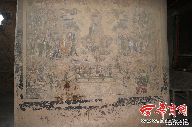 在榆阳区镇川镇石崖地村无定河西岸,始建于北宋年间的红云山悬空寺屹立在地势险峻的半山腰上,寺庙错落有致,风景优美秀丽。7月30日下午,华商报记者进入悬空寺最大的石窟万佛洞,首先映入眼帘的是石窟中两根四方形石柱,而石窟正面有几尊泥塑高约3米的佛像。窟中四壁彩绘着神态各异的万尊佛像,两根石柱四面也彩绘着构图精美的山水风光。有煞风景的是,游人刻画的“到此一游”等各种签名、涂鸦布满了壁画上,且大面积的壁画已脱落,损毁严重。“我在这里已照看10年了,平时几乎很少有人过来,只在三月初三、七月十五有庙会的时候,才有很多的游客。”今年76岁的看门人刘大爷说,他只是负责看门,对乱涂乱画不是很清楚。