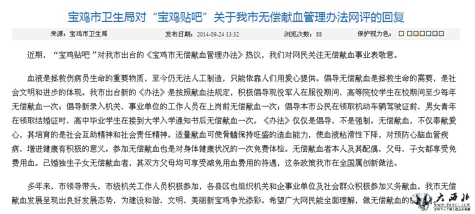 近期,“宝鸡贴吧”对我市出台的《宝鸡市无偿献血管理办法》热议,我们对网民关注无偿献血事业表敬意。