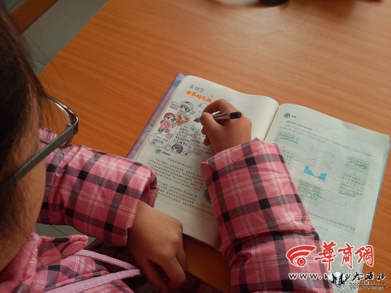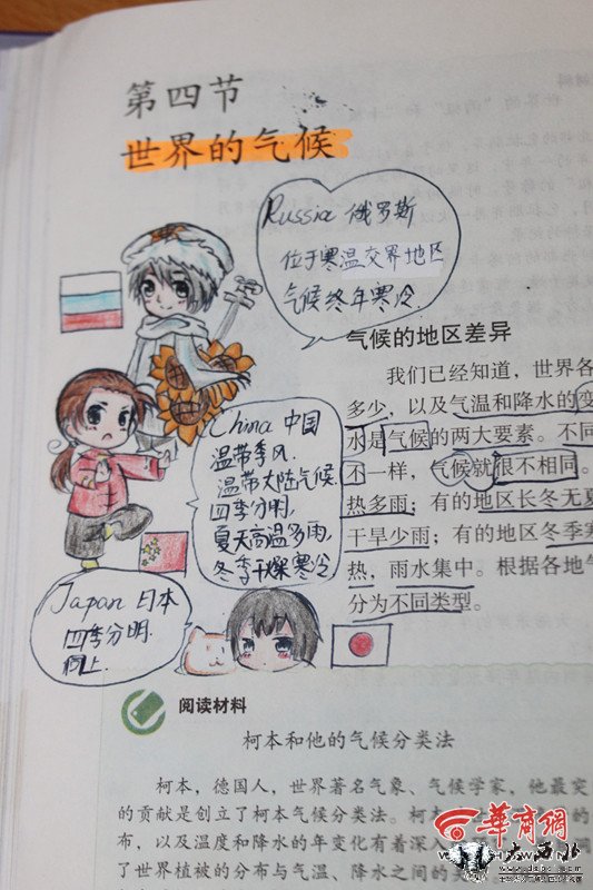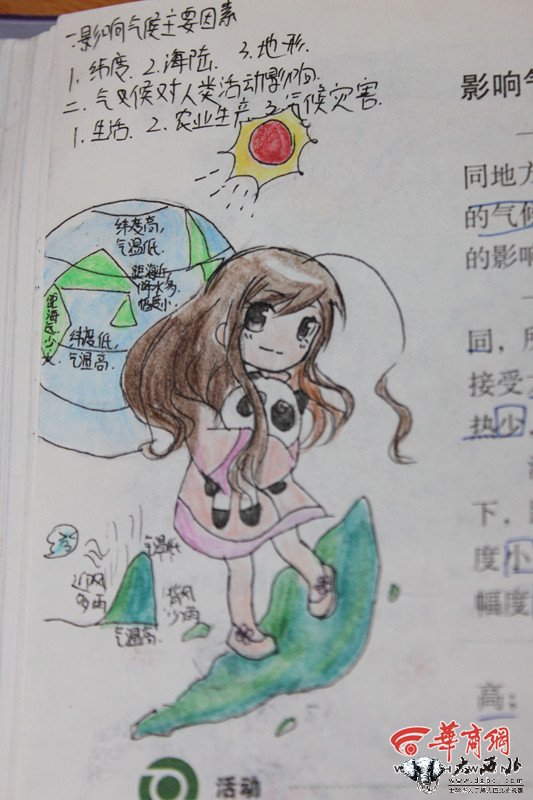昨日,华商报记者来到宝鸡市第一中学,翻开孙好语的地理课本,一幅幅记录课堂知识点的漫画生动活泼、主体鲜明,穿插在文字之间,而且不同国家的地理知识都以不同的穿衣风俗、文化背景表现出来,体现得极其精准、简洁明了。“每堂的漫画笔记最多只用3分钟,老师边讲我边‘创作’,一点都不影响学习,在课余时间,我准备将其他学科的笔记也用漫画整理出来,帮助同学们快乐学习。”孙好语说。