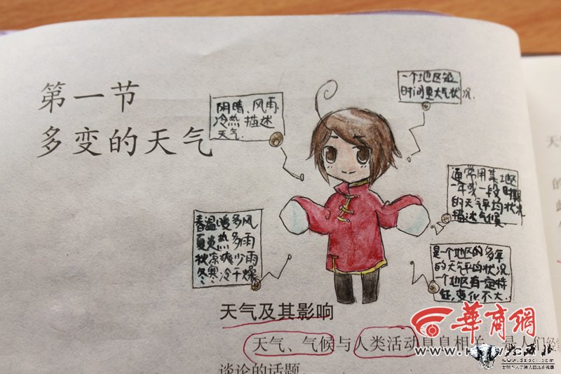 据宝鸡市第一中学初一(12)班孙好语介绍,通过漫画记课堂笔记,不仅提高了她的学习效率,而且使她对地理产生了浓厚的兴趣。她从小就喜欢画画,通过尝试用漫画记课堂笔记,不仅很成功,而且同学们几乎将她的地理课本当作漫画来传阅。