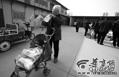 梁会娃是灞桥区十里铺街办草南村人,昨日下午1时许,在草南村村委会大院内,她和上百名老人早早地守候在这里,每个人脸上都乐滋滋的,他们大多数人都携带了工具,有的人推着小三轮车,有的人推着婴儿车,还有的拉着拉杆箱。