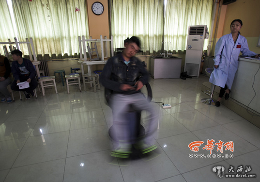 来自榆林定边二中的考生郑斌斌刚做完电转椅测试,这个测试要求考生坐上电转椅旋转90秒,下来后观察其变化。“转完有种天旋地转的感觉。”郑斌斌说,测试很严格,幸亏他通过了这项测试。测试人员称,这项测试主要是为了测试学生的平衡性和前庭功能,测试结束不能出现晕厥和冒虚汗的情况。