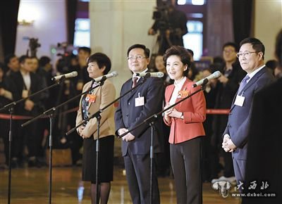 3月3日,中国人民政治协商会议第十三届全国委员会第二次会议在北京人民大会堂开幕。这是全国政协委员王宁利、海霞、张云勇、余留芬(从右至左)在“委员通道”接受采访。