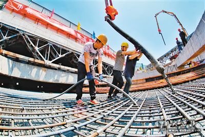 当日,施工人员浇筑最后一块顶板。 记者 王健 摄