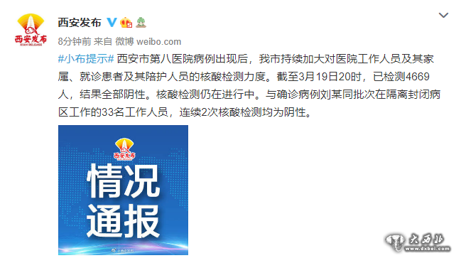 西安市第八医院病例出现后,我市持续加大对医院工作人员及其家属、就诊患者及其陪护人员的核酸检测力度。截至3月19日20时,已检测4669人,结果全部阴性。核酸检测仍在进行中。与确诊病例刘某同批次在隔离封闭病区工作的33名工作人员,连续2次核酸检测均为阴性。